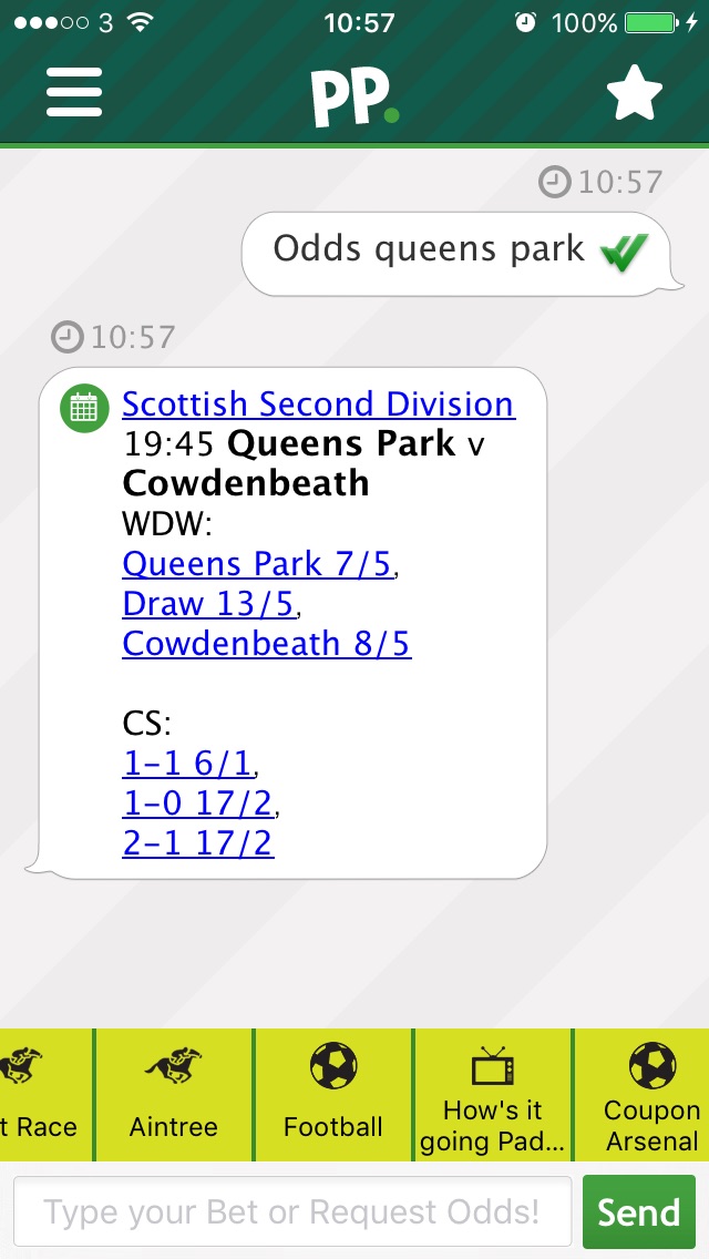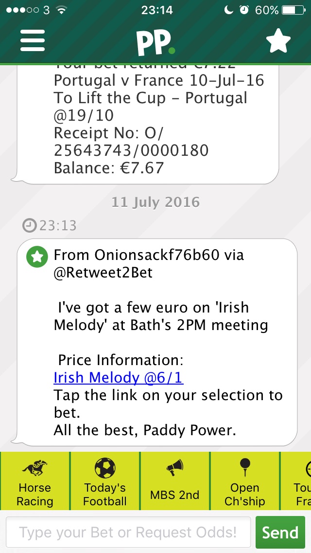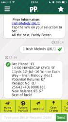 PaddyPower Messenger is an instant messaging client that puts punters directly in touch with their bookmaker. It hooks into the Onionsack platform which automatically parses and understands a written bet so users can just input their stake and selections, in a text form, to get their bet on.